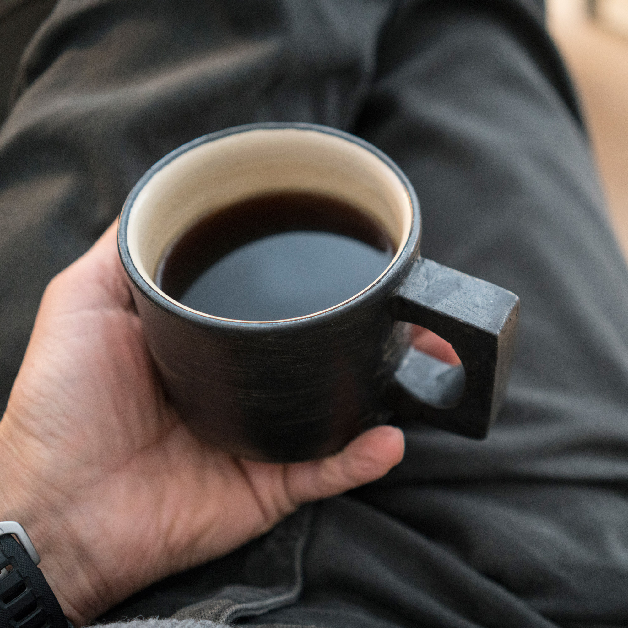 Das Highlight ist jedoch der Henkel: Seine reduzierte Geometrie, seine Abmessungen und seine parallelen Ebenen ermöglichen eine sichere und mühelose Kontrolle der Tasse. Während der Zeigefinger durch das Loch greift, stützt eine Viertelkurve die Tasse gegen den Mittelfinger ab und isoliert gleichzeitig gegen deren Hitze.