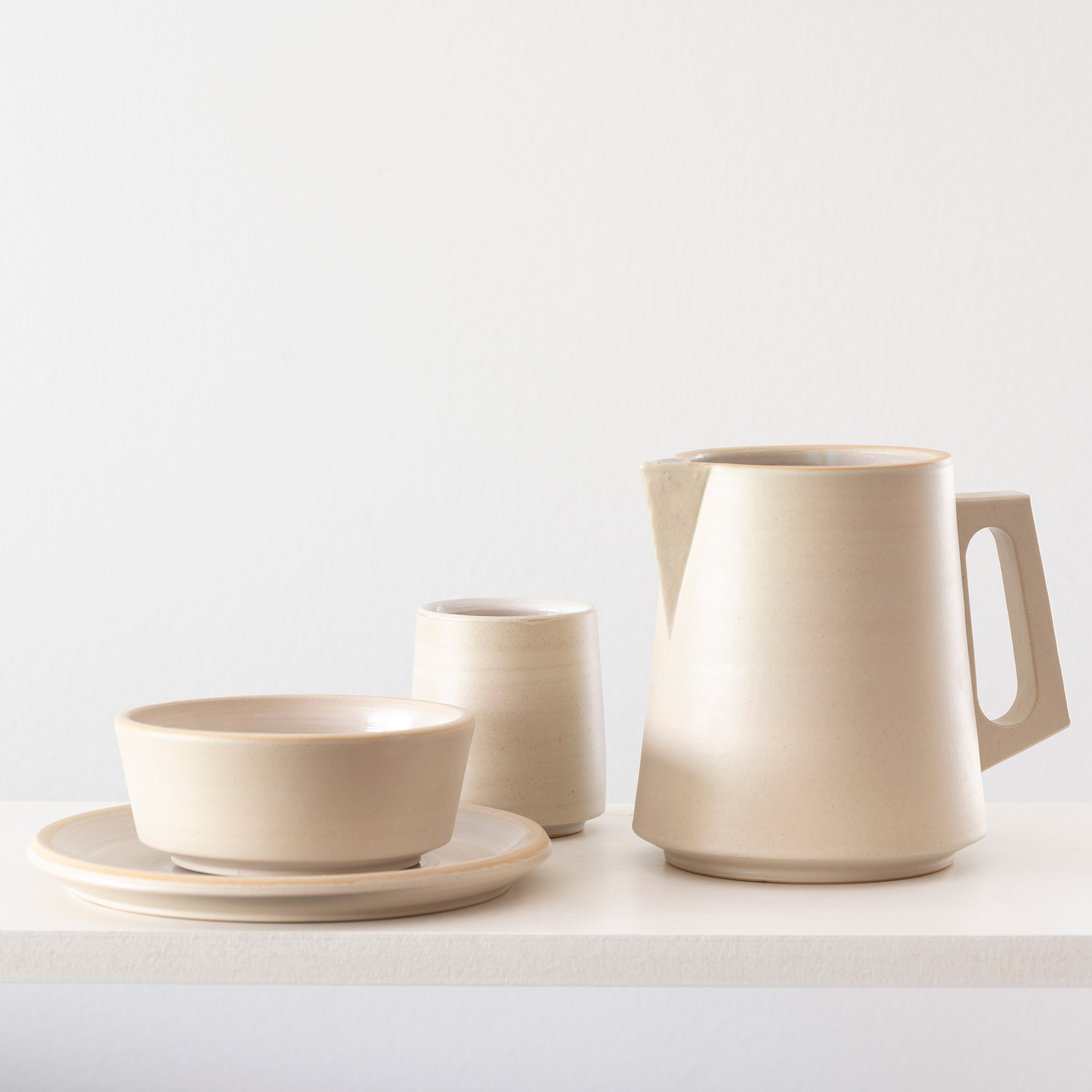 Teller waren schon immer ein Thema gewesen. Ich hatte sie gescheut, da ich der Meinung war, dass sie nicht in unseren Produktionsworkflow passen würde. Der Durchbruch kam, als ich, nachdem ich ein weiteres Mal vor die Herausforderung gestellt wurde, eine Teller zu entwickeln, ernsthaft darüber nachdachte und einen Versuch unternahm. Ich entschied mich dafür, ihn mit unserem typischen nackten Rand zu machen und so die Möglichkeit zu haben, Teller im Brennofen paarweise in einem Turm von jeweils vier zu stapeln. Obwohl kaum sichtbar, ist unsere matte transparente Glasur unter dem Rand aufgetragen. Die Oberseite ist mit der gleichen weißen, glänzenden Glasur versehen, die für fast alle unsere Keramiken im Inneren typisch ist.